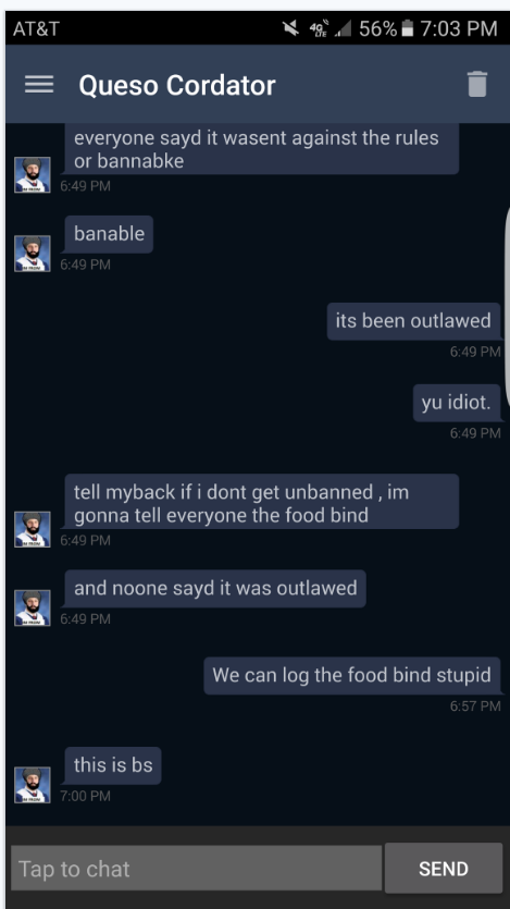 Evidence to support claim (if any): first of all , I was told food binds aren't against the rules , second of all I never targeted anyone for harassment , I might have sayd things like I hate n♥♥♥♥rs but it wasent towards anyone , and having other people talk for you is not in the rules , and I never threatened attempt of porn involving minions except of saying , if her age is on the clock shes ready for the cock , witch was an obvious joke