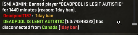 SennyK myback wrote Do you have any demos or video footage of this incident? Also in the first screenshot: This is a pretty justifiable ban...judging by his name. I have only screenshots of this. I made this report to show that deadpool muted the whole server and permagagged bubble for no reason (in turn, his reaction caused him to be banned for a day). To me, it seems like deadpool baited him into being banned